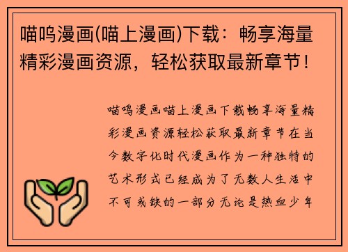 喵呜漫画(喵上漫画)下载:畅享海量精彩漫画资源,轻松获取最新章节! 在当今数字化时代,漫画作为一种独特的艺术形式,已经成为了无数人生活中不可或缺的一部分。无论是热血少年漫、甜蜜恋爱漫,还是悬疑推理...