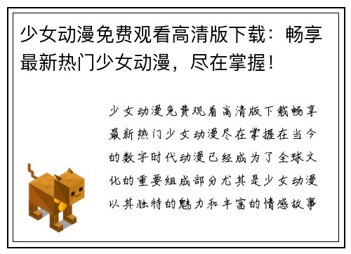 少女动漫免费观看高清版下载:畅享最新热门少女动漫,尽在掌握! 在当今的数字时代,动漫已经成为了全球文化的重要组成部分,尤其是少女动漫,以其独特的魅力和丰富的情感故事吸引了无数观众。对于热爱少女动漫...